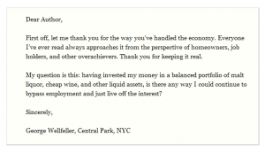 My question is this: having invested my money in a balanced portfolio of malt liquor, cheap wine, and other liquid assets, is there any way I could continue to bypass employment and just live off the interest?